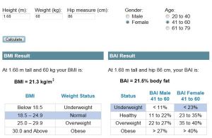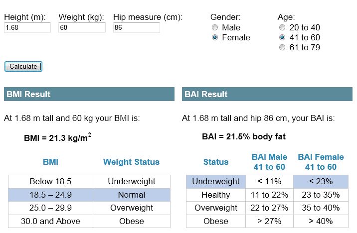 1. Jag är överviktig (bara precis) på bmi och normalviktig på BAI så det var ju trevligt ;-). Men mindre ska jag bli, har egentligen ingen betydelse vad vare sig BMI eller BAI säger, jag är långt ifrån underviktig i alla fall 🙂
