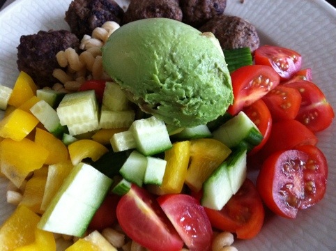 Ser ut nästan precis som min lunch… fast det var biffar istället för bullar och råris istället för vad jag gissar är fullkornspasta : )