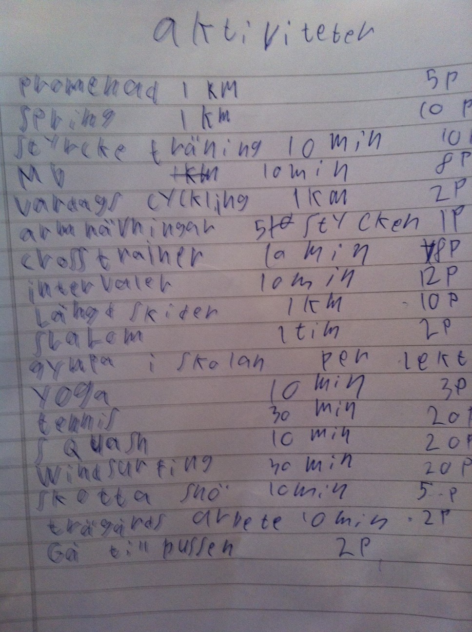 3) Ett excelark för utskrift där vi skriver upp våra poäng per aktivitet/dag