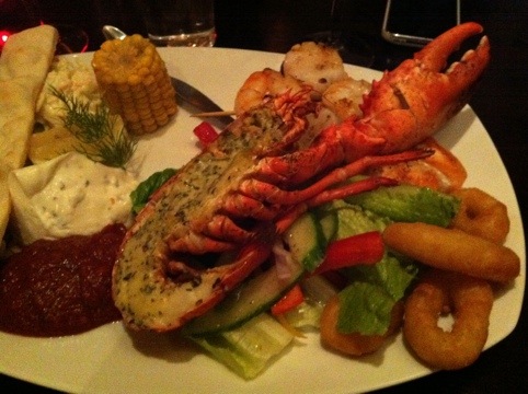 Det syns inte men det ligger en laxkotlett under hummern.. Så jag åt INGEN friterad bläckfisk, bröd eller annat strunt.. 🙂
