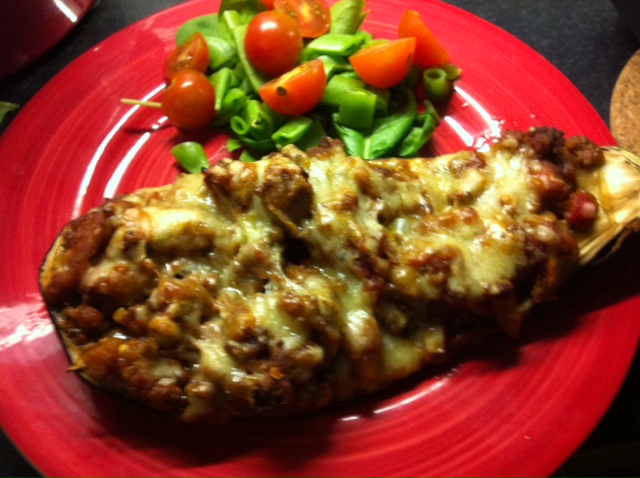 Idag blev det smaskiga aubergine halvor till middag:-) Vi gjorde en röra av nötfärs, urgröpningen från auberginerna, lök, chili, ajvar,tomatpuré och krossade tomater. Kryddat med spiskummin, lite curry, svartpeppar och salt.