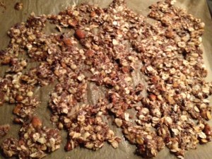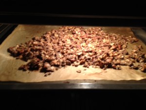 Jag körde nötterna i en matberedare så de blev i olika storlek på bitar. Blandade i övriga torra ingredienser och blandade in äggvitorna i slutet. Jag plattade ut allt på ett bakplåtspapper och sedan ringlade jag lite agave honung i rutor. In i ugnen på 225-240 grader, vänd och peta på dem emellanåt tills de är krispiga…