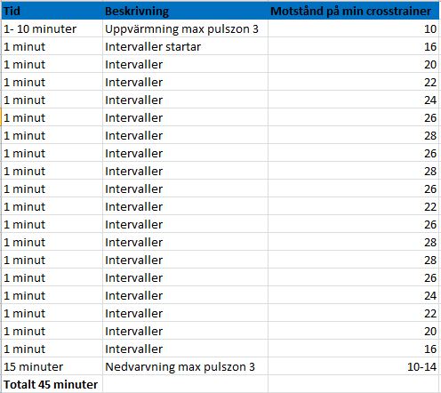 Aminosyror + dubbel espresso före passet och körde jag intervaller enligt nedan och avslutade med stretch!
