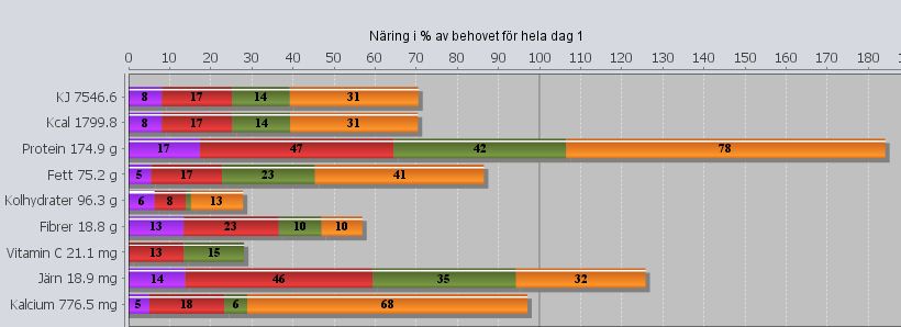 Så nu har jag gått över på fett, och för lågt på protein och kolhydrat.. skratt. Får experimentera med att ta bort lite saker för att få det rätt men det närmar sig? (Ser nu att om jag tar bort halv dl mandel på fikat så blir fettet bra… Skit oxå 🙂 ) (Det är dock kvar i diagrammet nedan, fettet går ned till 55 gram och kcal till ca 1550 ..)
