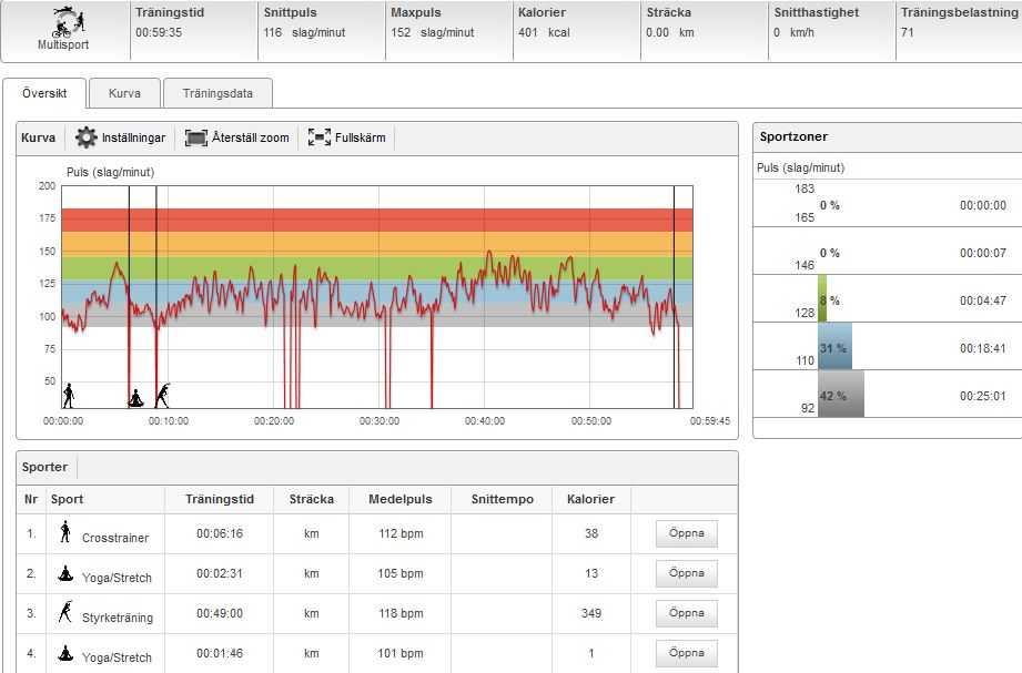 Jag ska stryka en övning i programmet och det är en av magövningarna som var menlös.. Jag är förvånad över hur låg pulsen var trots att jag hoppade mellan varje övning men start-testet/”anden i klockan” sa att min puls är under normala nivåer idag igen. (alla uteblivna pulsdelar nedan är övningar på magen :-))