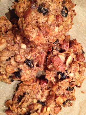 Tager vad man haver är melodin;) Min ”ojsan-nu-är-det-tomt-i-kylen”-ica är inte så välsorterad så det blev torkade tranbär istf blåbär och boveteflingor istf dinkel som sagt men det blev jättegott! Tack för receptet