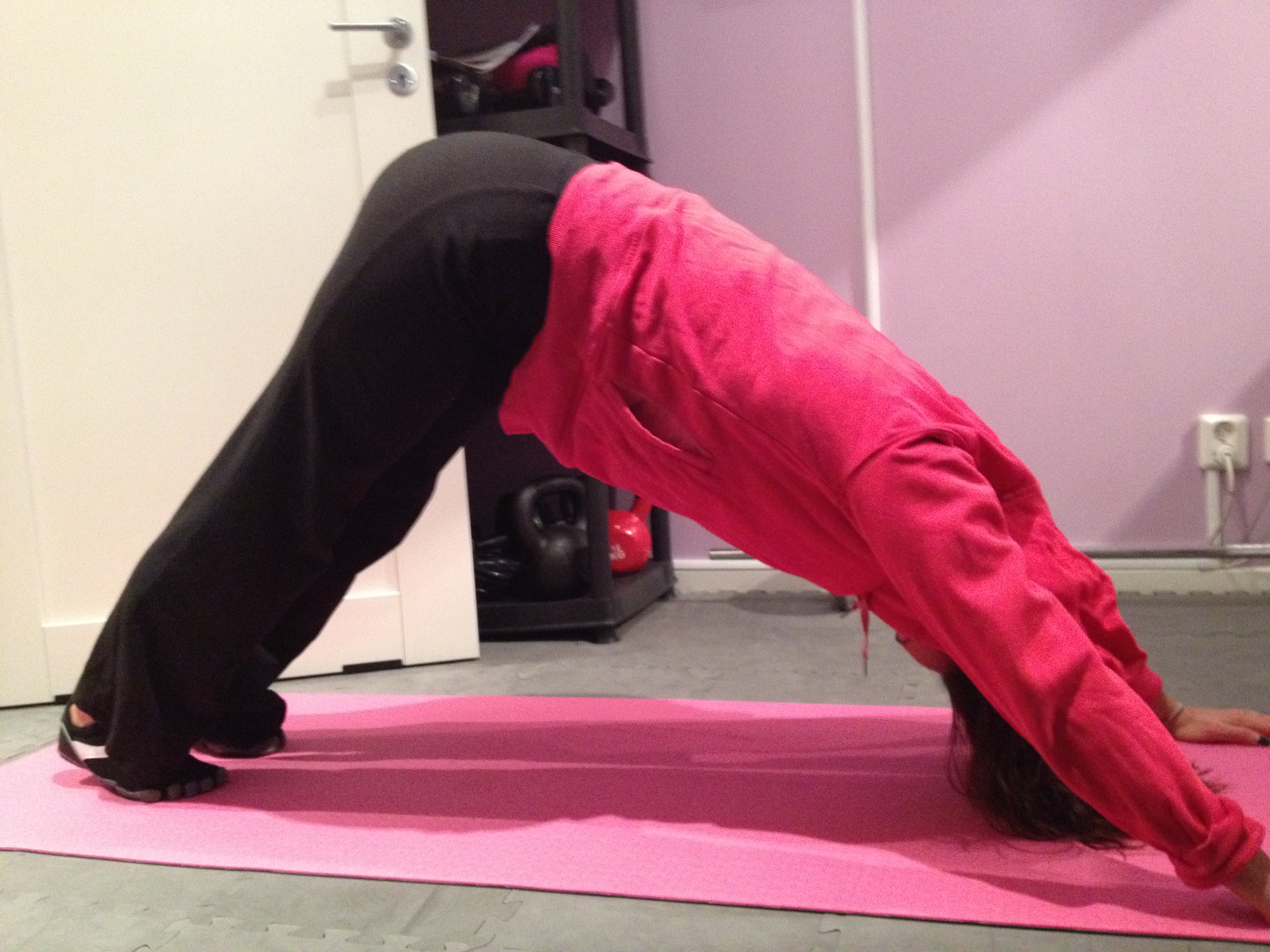 • Stå i downward dog och stretcha vaderna en i taget (2 min totalt)