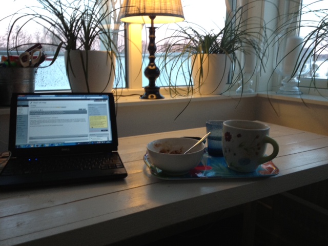 Jag har yogat i 20 minuter i mörkt gym nu på morgonen och stretchat och väckt min kropp. Nu blir det jobb från hemmakontoret och sedan kiropraktor på lunchen och sedan hemmajobb igen. Ikväll är det veckohandling och det är tur för kylskåpet är helt tömt på grönsaker… Jag kommer att få trolla fram en lunch idag 🙂 Frukosten idag är havregrynsgröt, 1/2 proteinshake + vitaminer och stoooor mugg grönt te.