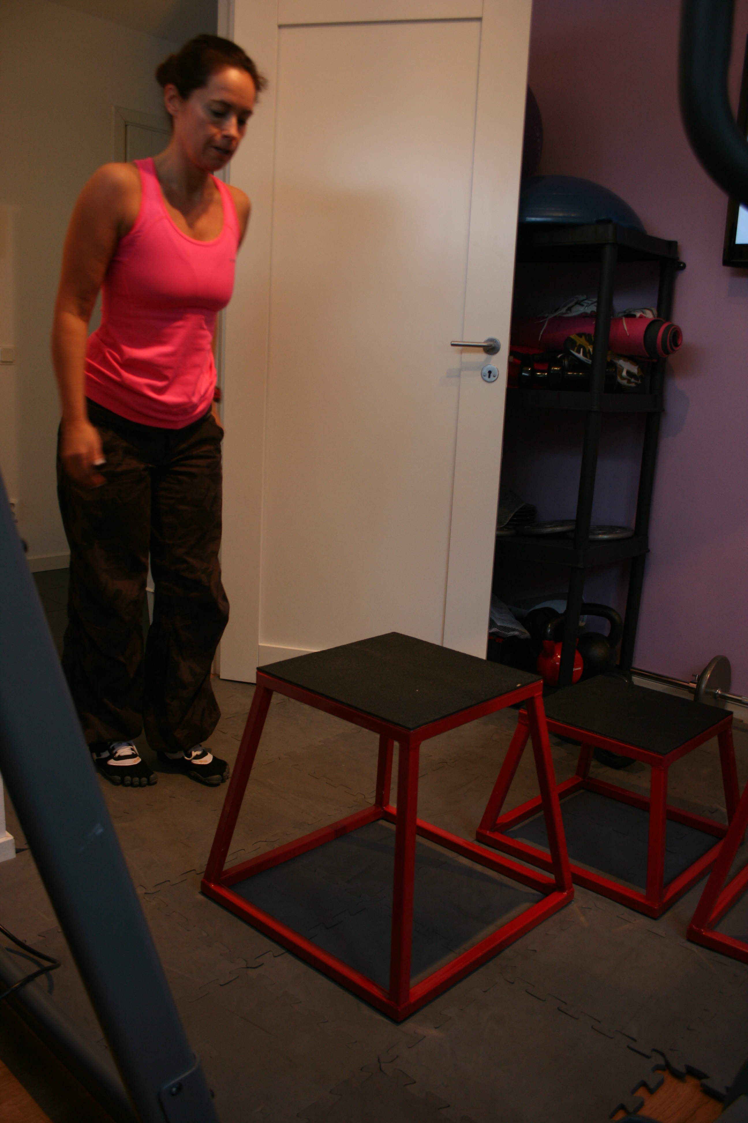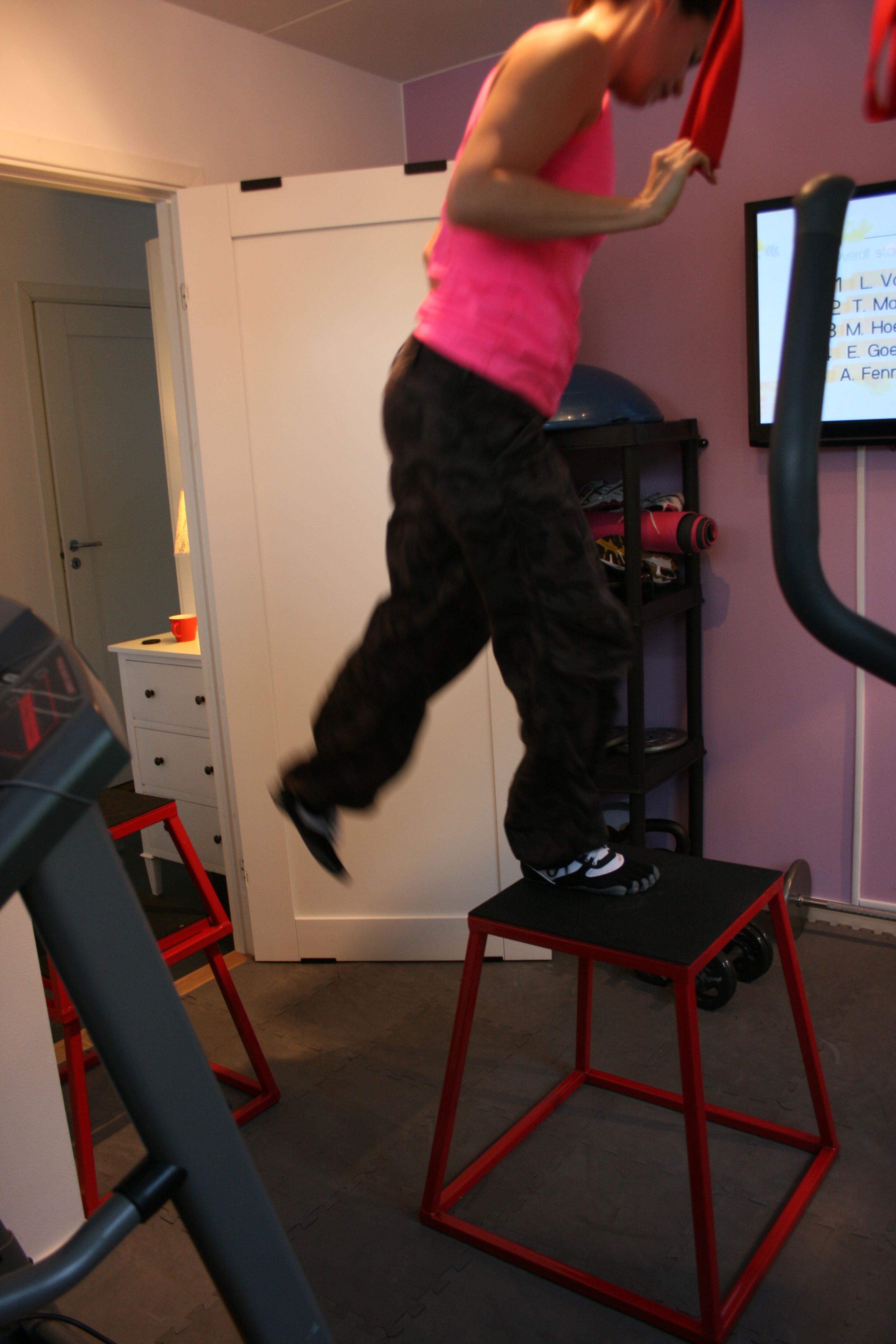 - Gående utfall (Runt nedervåningen 20-20-25) med hantlar – Upphopp på mellan-plyoboxen (4-9-10) – Plyobox step up (största/högsta) med redcord i handen 8/11/14 per ben