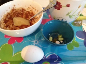 Det blir ingen träning idag och när jag känner efter hur jag mår så blir det nog ingen träning lördag eller söndag heller. Dagens frukost är det enda jag kan komma på att rapportera om; havregrynsgröt, 1 kokt ägg och vitaminer och echinaguard 🙂