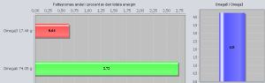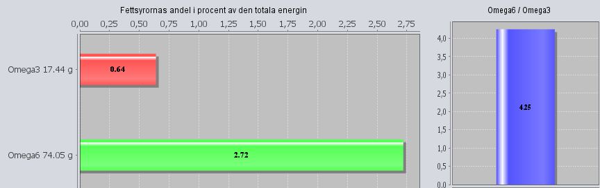 Bilden visar Omega 3 och Omega 6 intaget i min kost sista 14 dagarna och relationen mellan dessa. I en perfekt värld ska alltså den röda och gröna stapeln vara lika långa och just nu är relationen ca 1:4. Till detta äter jag extra Omega 3 kapslar som varierar mellan 171-300 mg omega 3 fetter per kapsel, jag tar oftast tre stycken. Detta gör ju att stapeln blir bättre MEN då har något geni även stoppat in Omega 6 i mina nya kapslar så jag hamnar tillbaka på ruta 1? Såååå, köp INTE Omega 3 kapslar MED Omega 6 i sig. (linolsyra, gammalinolensyra, DHGLA syra, arakidonsyra (AA). Både Omega 3 och Omega 6 är essentiella och måste tillföras i maten men Omega 6 får jag i alla fall jag i mig enkelt genom att äta; fiberhavregryn, jordnötssmör, sötmandel, kyckling, avokado, dinkel mm.