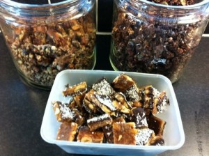 Blanda ihop allt, platta ut på bakplåtspapper. Sätt i ugnen i 180 grader i 15 minuter. Låt det sedan ”torka” på plåten. Bryt sönder och förvara i tätslutande burk.