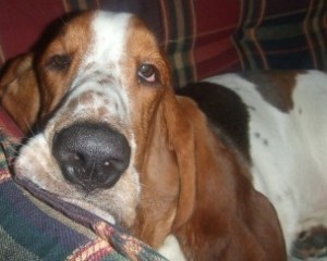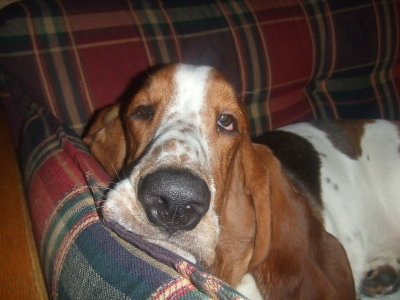 Tyvärr inte min vovve, lånat kort.. Jag äääälskar bassettar men är allergisk, dock är jag VÄLDIGT lik denna hund idag:-) Kraaam!