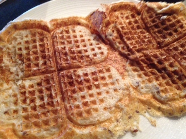 Kör allt med mixer så havregrynen blir som mjöl. Jag hade lite Cocosa (kokosfett) på järnet i varannan stekning (mini mini bit). Totalt 16 smaskiga våfflor som ska ätas direkt.