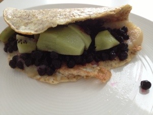 Jag blandade ihop sakerna med en gaffel och stekte som en pannkaka i kokosolja. Tillbehören idag blev blåbär, kiwi och lättsockrat äpplemos:) Total tid ca 6 min.