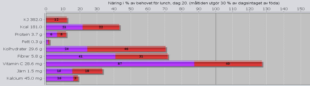 I diagrammet nedan så är sötpotatis LILA och potatis är RÖTT. Båda är ugnsbakade och väger 100 gram:-)