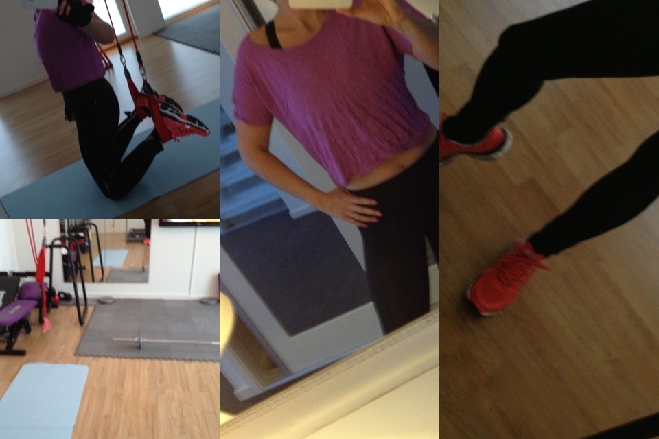 Sedan drog jag ner min redcord (TRX liknande sak) från taket och lyfte fram en LÄTT skivstång och körde: