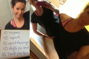5 varv med 10 rep per övning, totalt ca 15 min… Snacka om snabbträning!!