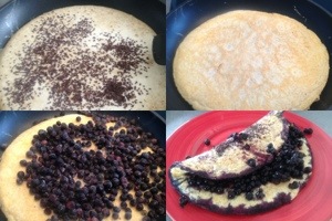 Jag stekte i kokosolja och när jag hällt upp smeten i pannan så pudrade jag med psylliumfrön. Efter vändningen av pannkakan så hällde jag över 1 dl frysta blåbär som fick bli varma på pannkakan. Jag lägger ihop pannkakan och låter det vara i stekpannan någon minut före jag lägger upp det på tallriken.