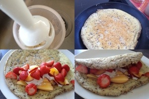 Stek en pannkaka av det. Jag åt med nektarin och jordgubbar samt mixad keso m lite sukrin!
