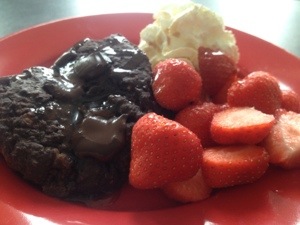 Annie serverade med frosting, jag provsmakade min variant och gillade den inte.. Jag åt med en klick grädde och färska jordgubbar och var supernöjd! Kakan är så len och härlig och MÄTTANDE. Chiafröna gör att man inte orkar någon större bit. Lurigt:) För er som diggar kokosgrädde ska nog prova med det och för det lilla extra så ringla på lite ren lönnsirap:) Mmmmmmm…