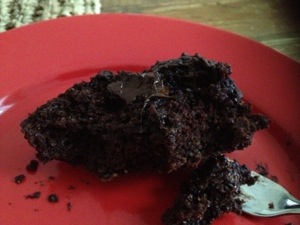 Jag lade ner alla sakerna och körde sedan runt det snabbt i bakmaskinen. Sedan hällde jag upp den i liten sockerkaksform som jag lagt bakplåtspapper i. Jag tryckte ner 2 rutor 70 % mörk choklad i smeten (i små bitar)