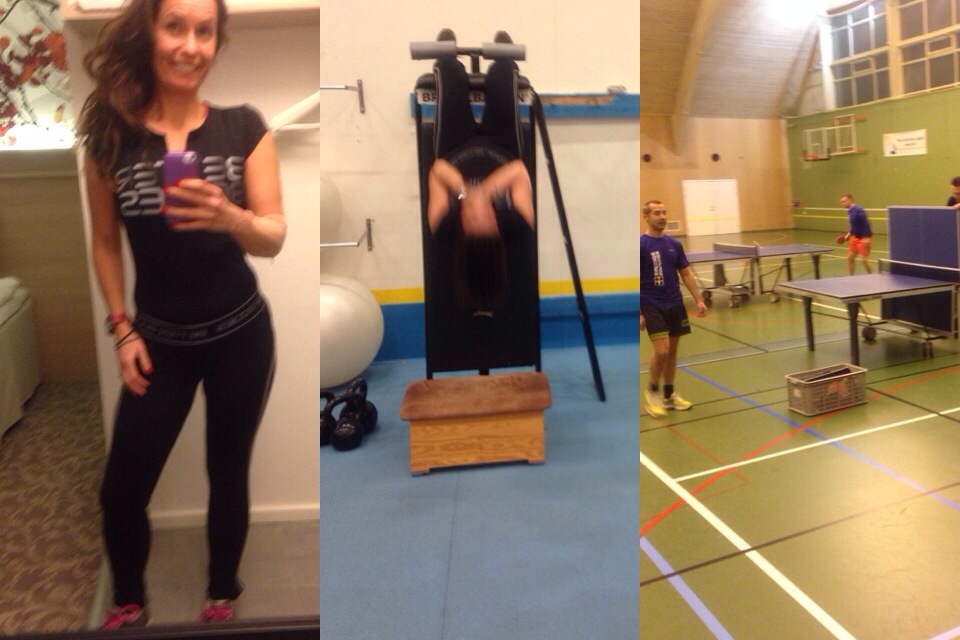 Måndagen så lekte jag kort i stora gymmet/hallen med brutalbänken (mittenbilden längst ner) och chins och dips och sedan hade vi bolllekar i en timme.