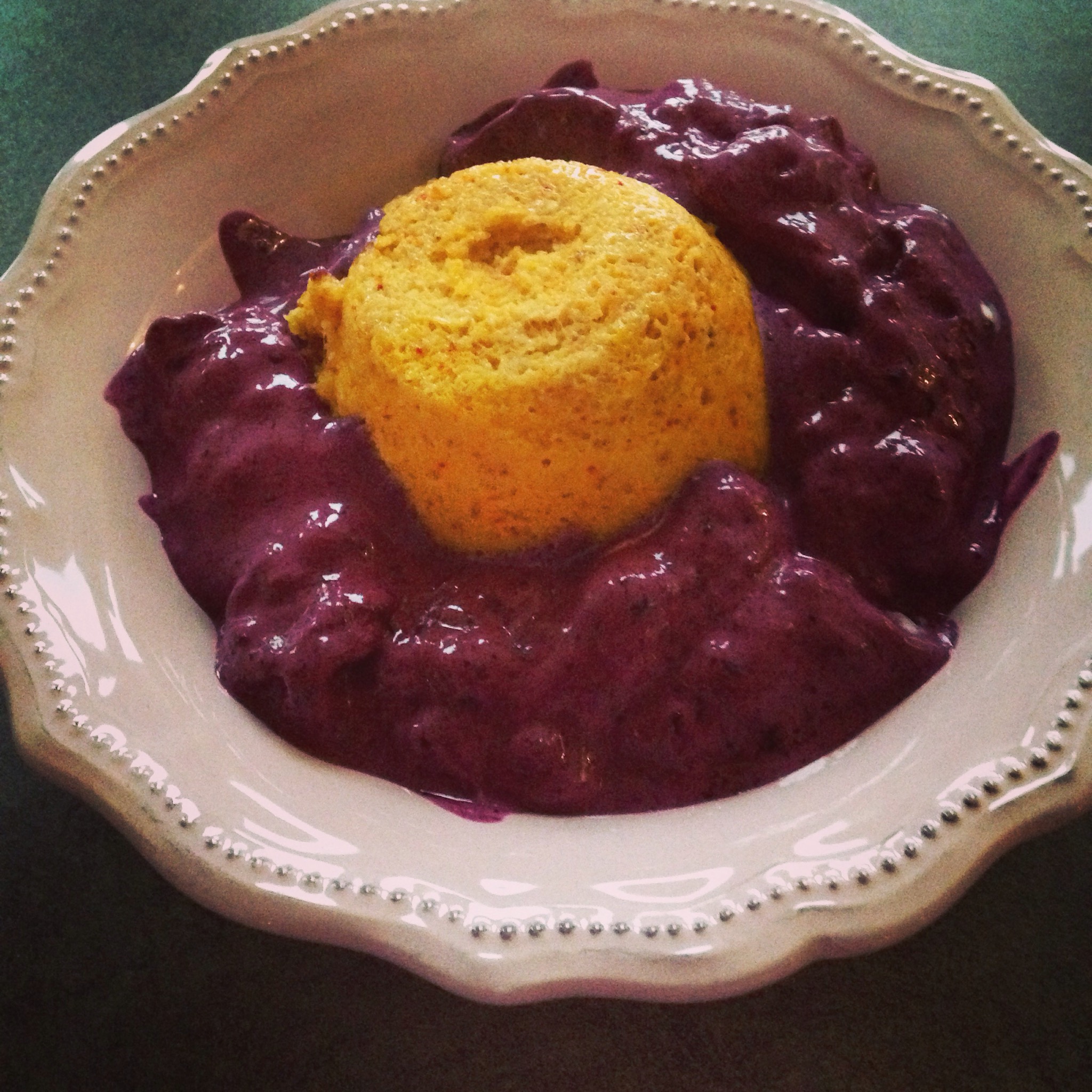 Jag stjälper upp kakan i djup skål och häller blåbärsröran runtom.
