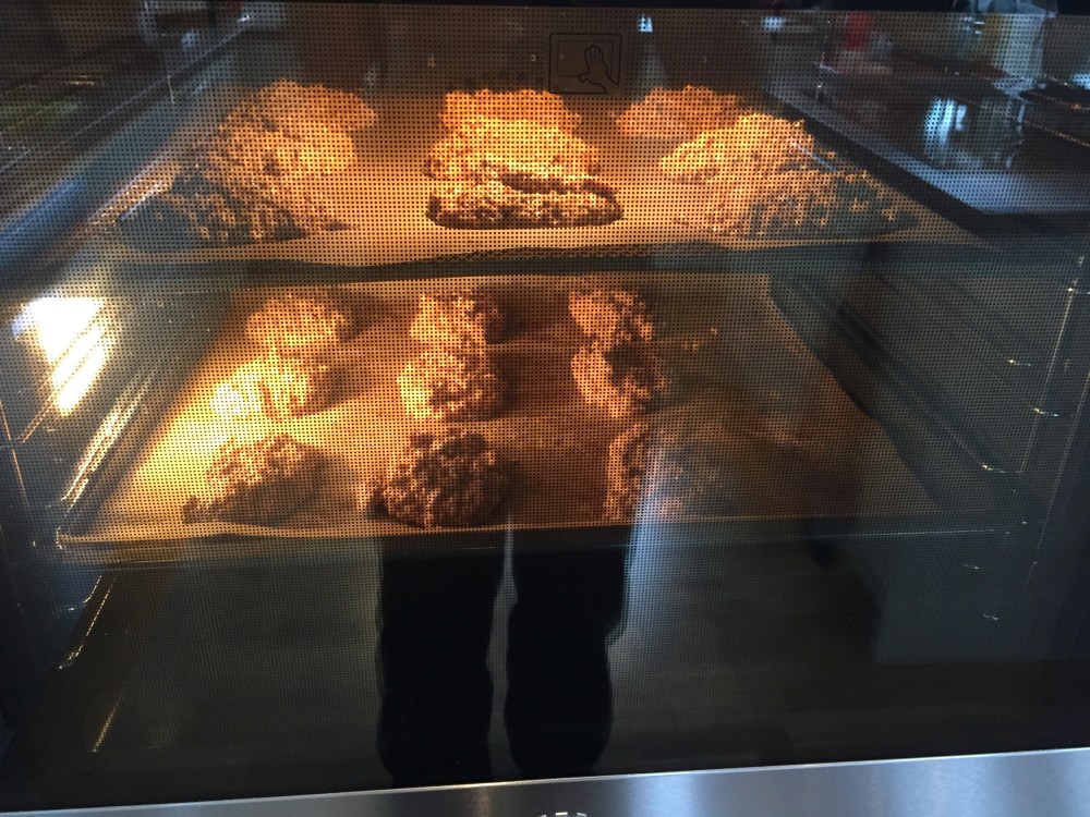 Kör allting i matberedare. Klicka ut på bakplåtspapper och kör i ugnen i ca 15 min i 200 grader.