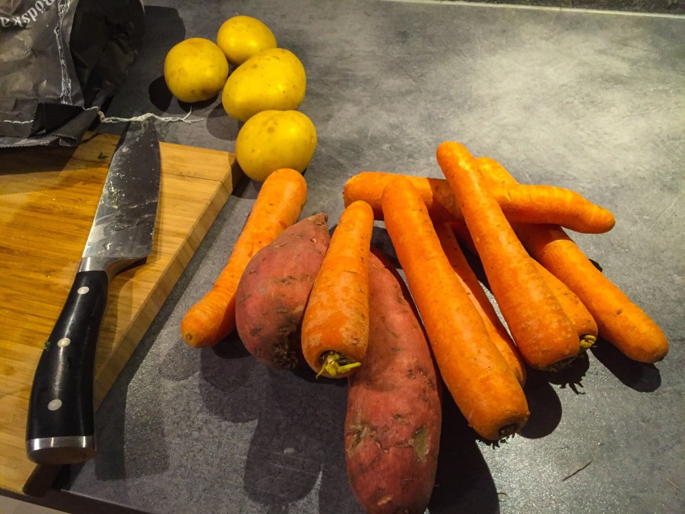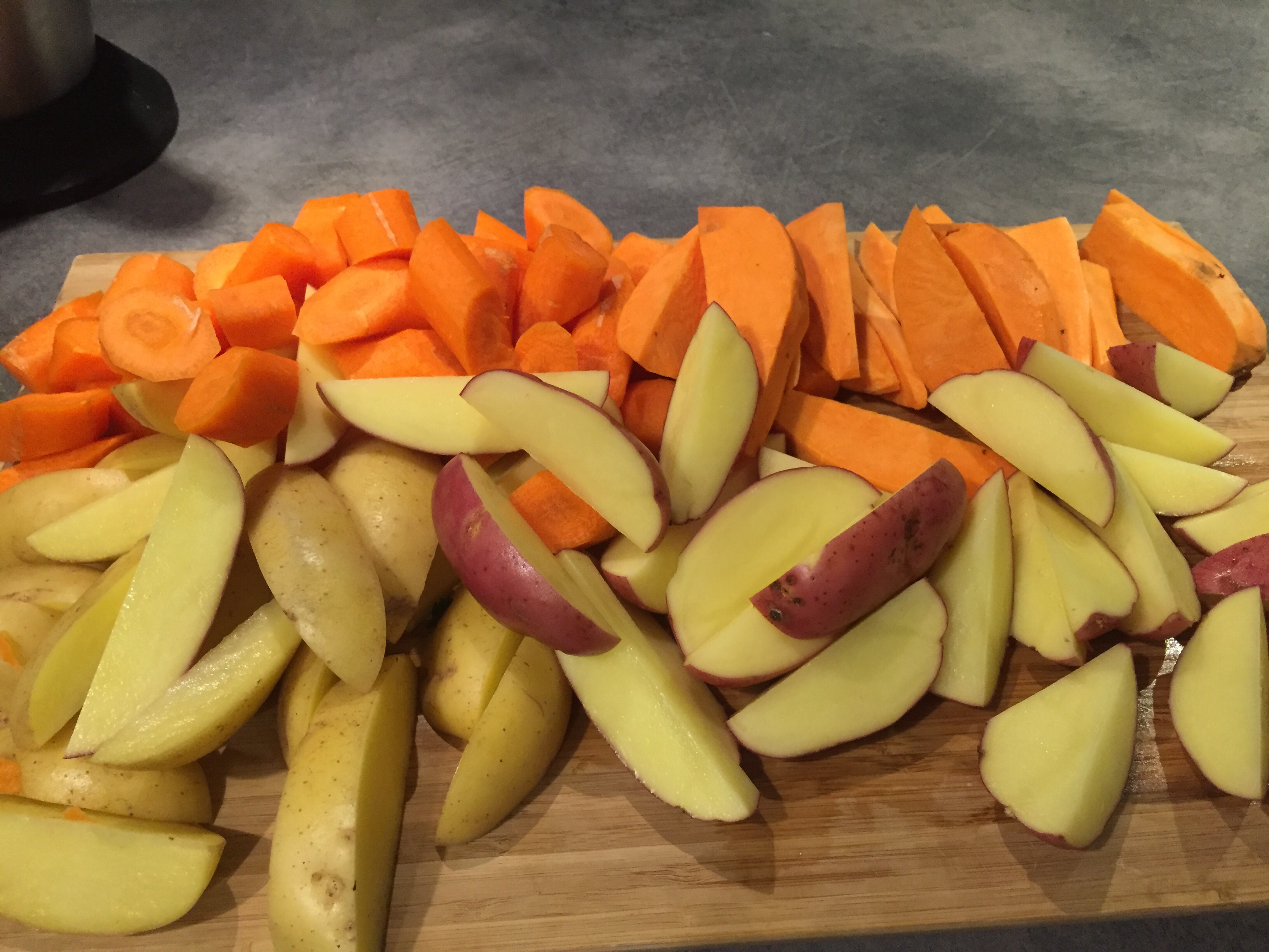 Efter 30 min i ugnen så lägger jag till potatis och grönsaker runtomkring. Ringla lite olivolja och salta, peppra och strö över lite timjan.