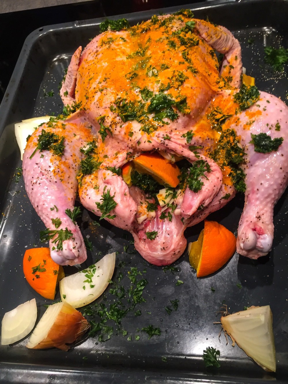 Pressa resten av apelsinen över kycklingen. Lägg apelsinresterna, halva löken och en näve persilja runt kycklingen.