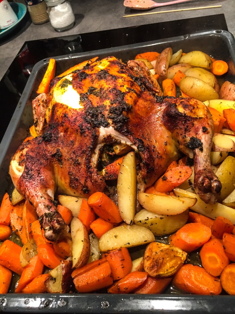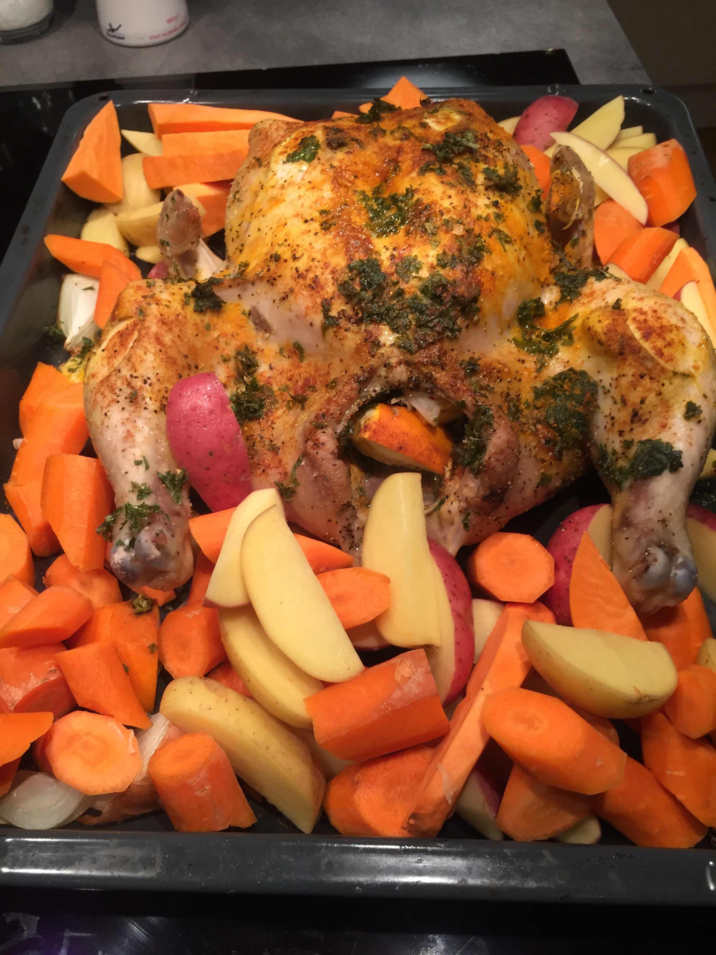 Köpte en stor hel kyckling som vi ugnsstekte till middag. Vill du prova?
