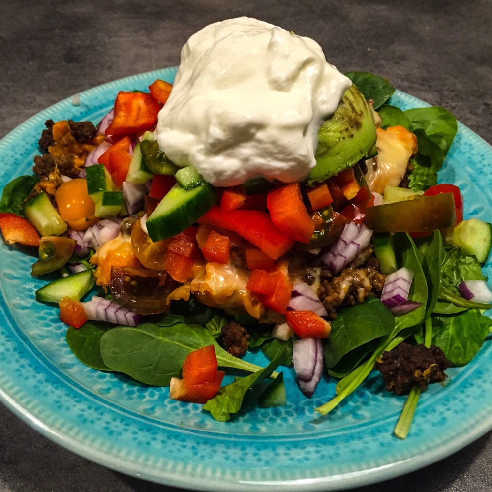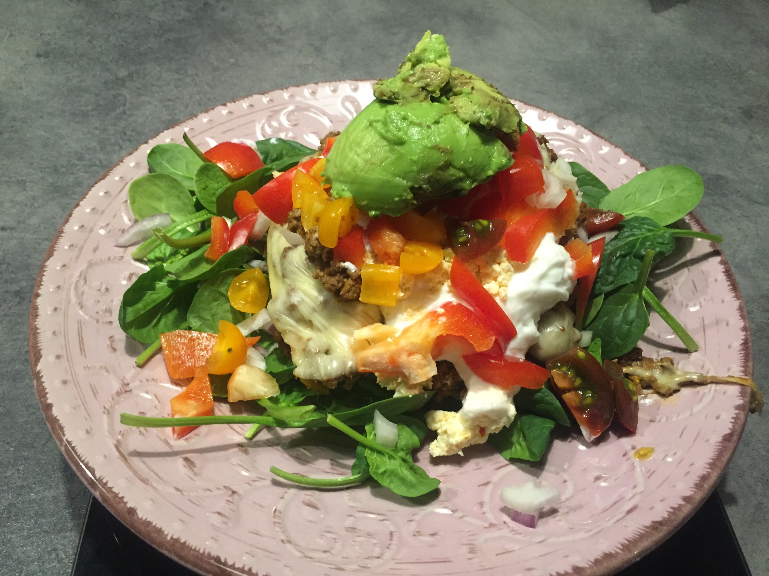 Lägg upp potatisen med röran på din tallrik, gärna på en bädd av spenat. Jag ligger också på hackad tomat, paprika, lök, avocado och kanske lite majs och annat som du tycker är gott.