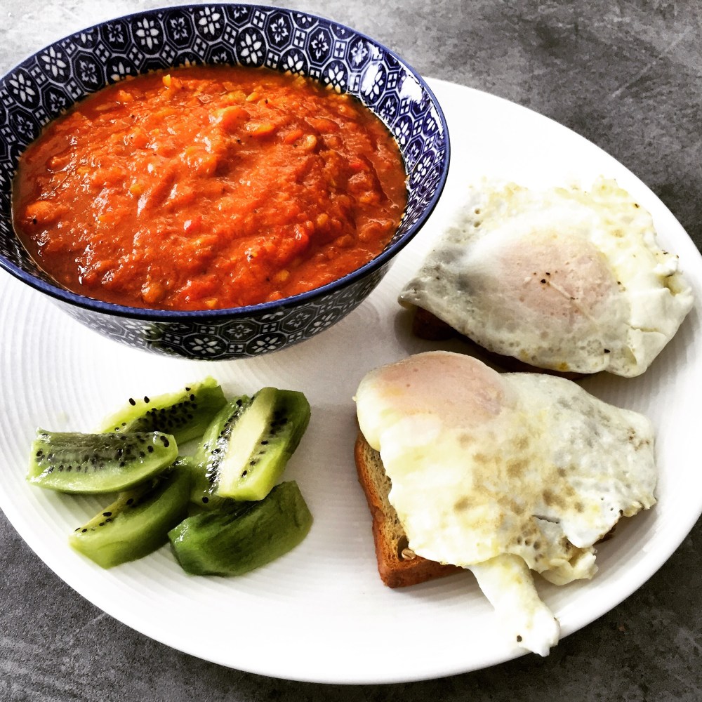En härligt varm och mättande soppa! Jag brukar lägga till exempelvis två proteinbröd (ex Carbzone) med två stekta ägg och en frukt för en bra balanserad måltid.