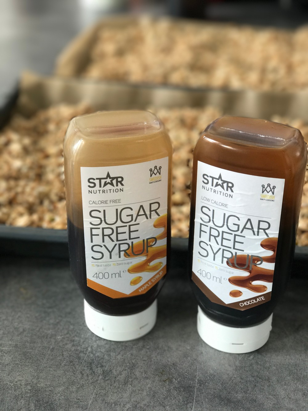 Jag blandar allt förutom sirapen och fördelar på 2 plåtar (för 4 x receptet). Jag ringlar över sirapen och blandar lite.