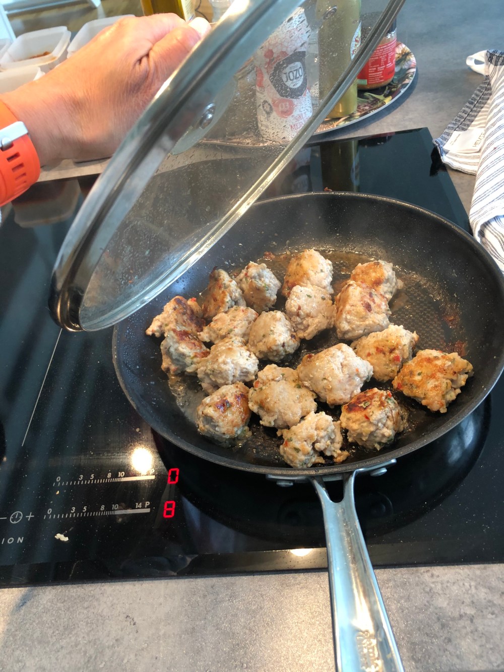 Stek runt om och låt koka med buljongen 5-7 minuter i slutet. Lägg 1/4 av frikadellerna i varje skål.