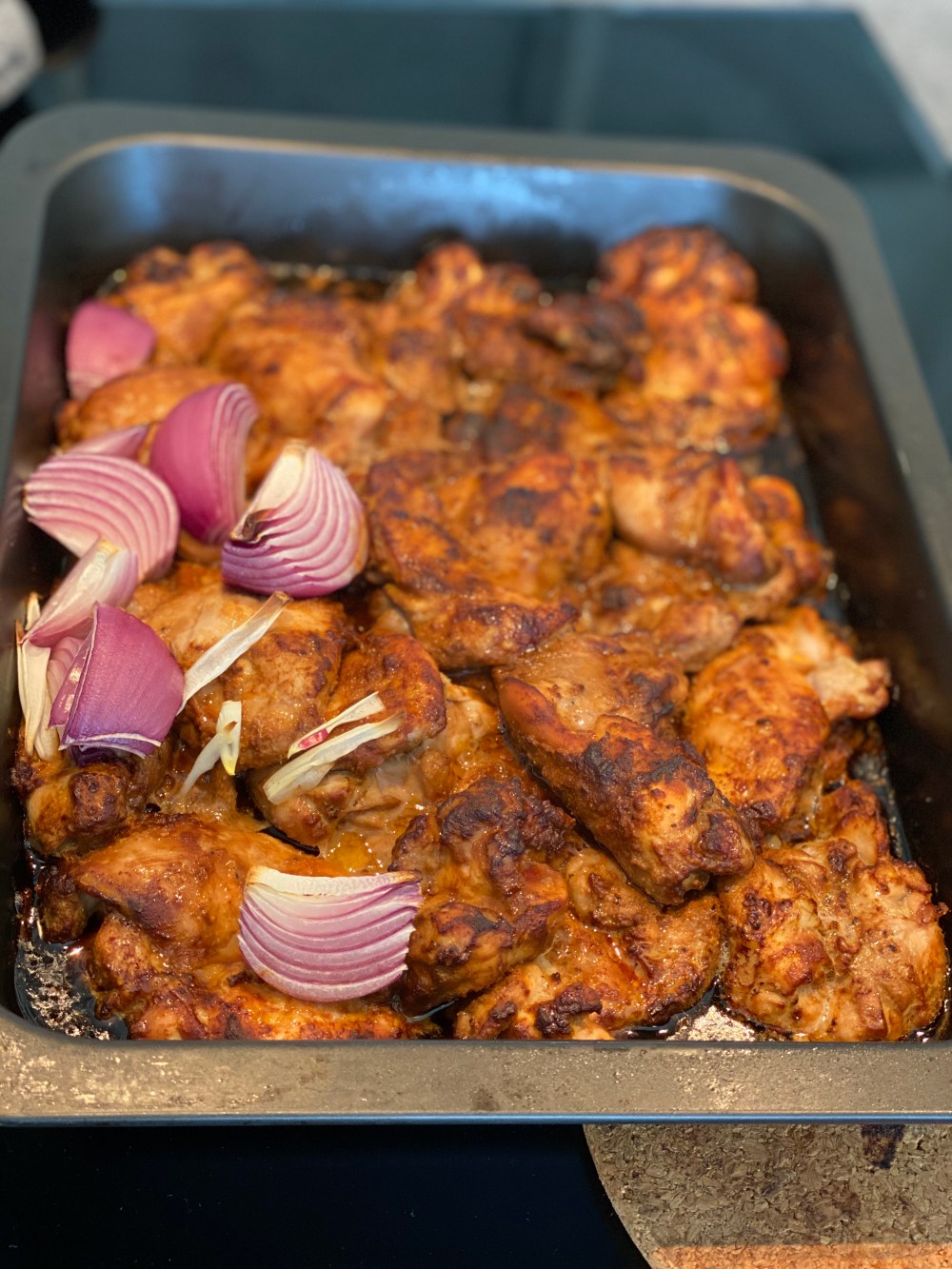 Lägg marinerade kycklingen i ugnsform (modell större) och kör i ugnen 200 grader i 30 min. De ska se färdiga ut och ha fin yta med vätska runt sig.