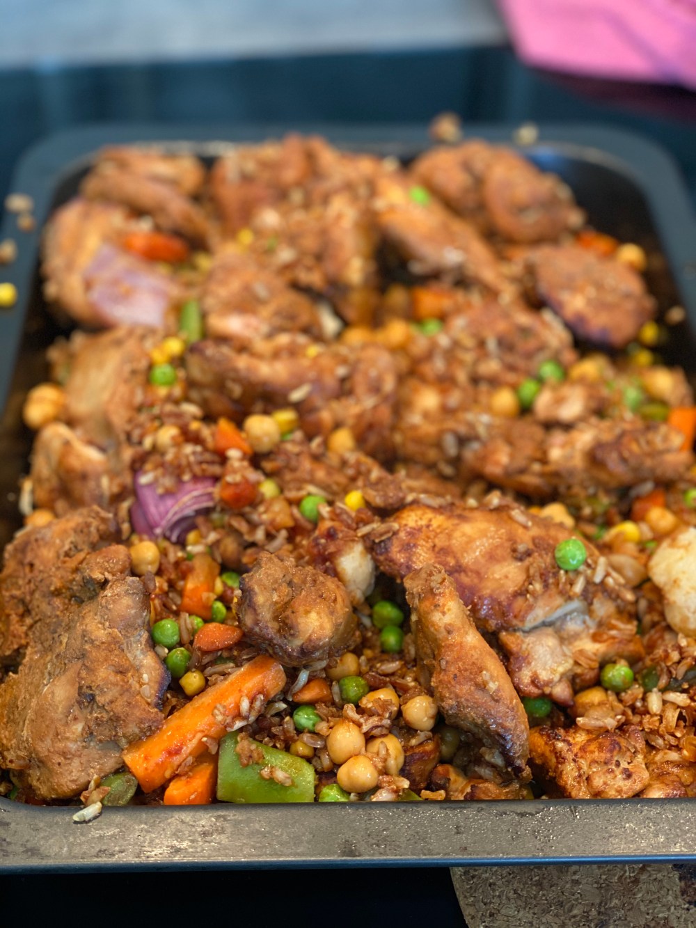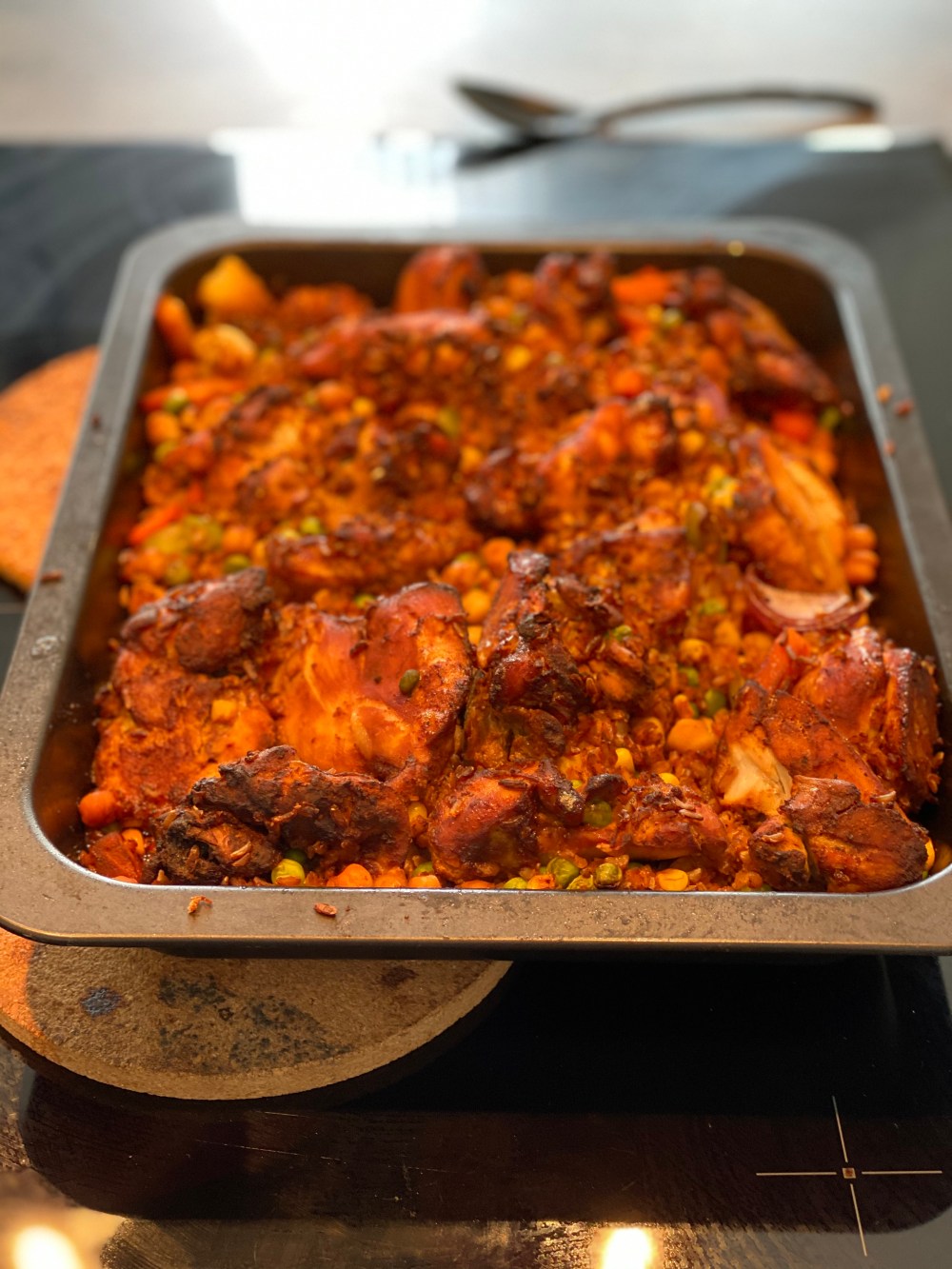 Blanda sedan ner detta i ugnsformen och låt det blanda sig med kyckling och ”buljongen”. Kör i ugnen i 210-225 grader i 25-30 min så att det översta lagret blir lite krispigt.