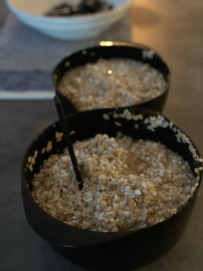 Vänd ner alla ingredienser i 1-2 bunkar (beroende på storlek) med en degspade. Låt smeten svälla över natten eller dagen så att den blir härligt geggig.