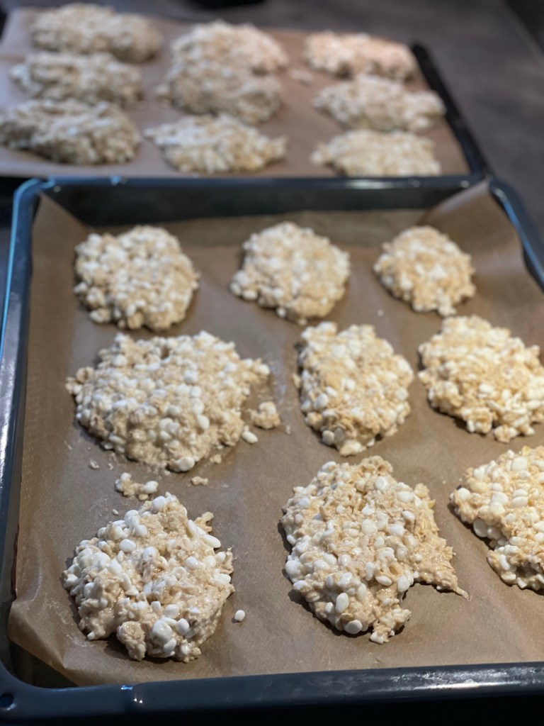 Klicka ut smeten i tekaka-form och tjocklek på bakplåtspapper, smeten blir 4 knökfulla plåtar. Grädda i varmluft i 200 grader i 25-40 min. De ska ha färg men inte för mörka, för då blir de torra.