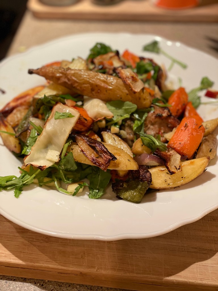 När maten är klar, ca 35 minuter, så blanda ugnsgrönsakerna med ruccolasalladen.