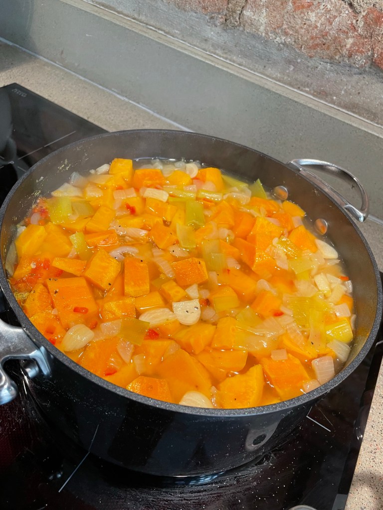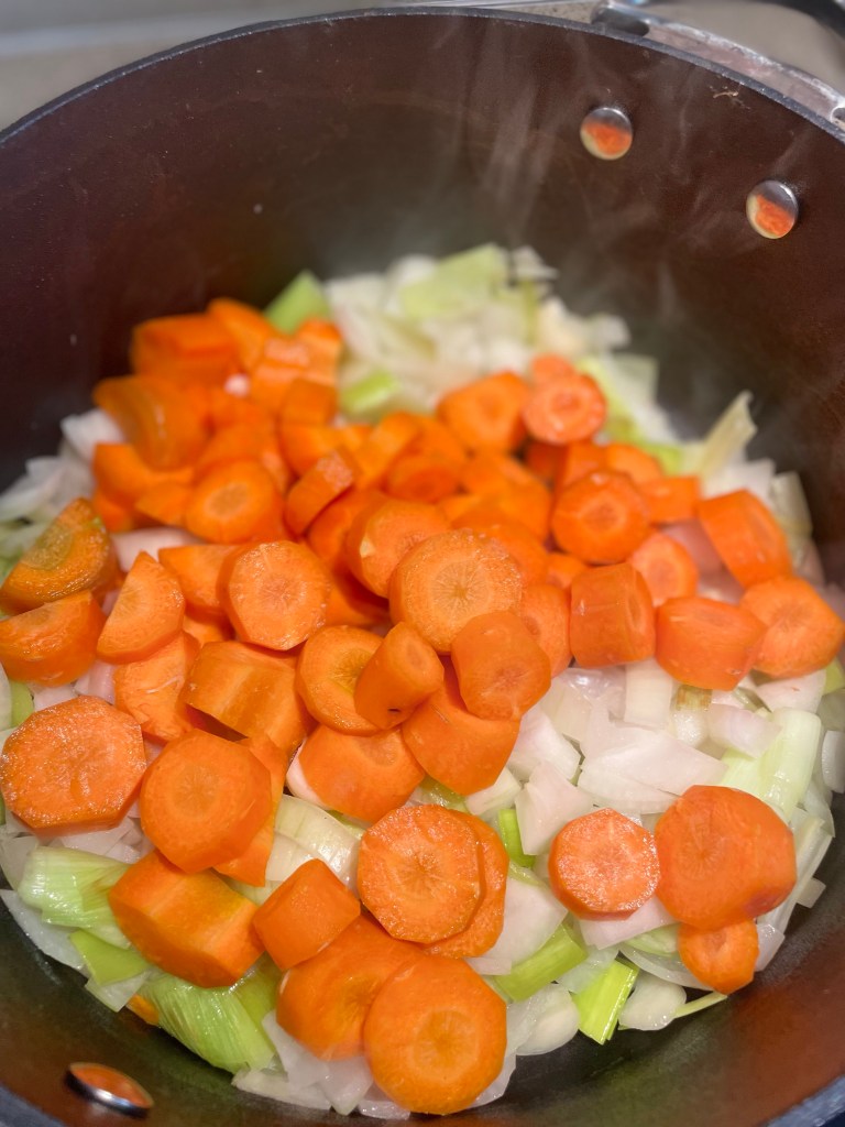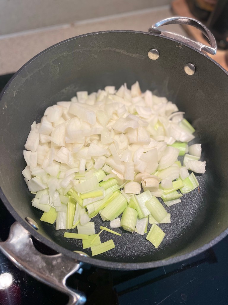 Hacka halv purjo, 2 vitlök solo och 2-3 gula lökar grovt. Fräs i stor kastrull med lite olja.