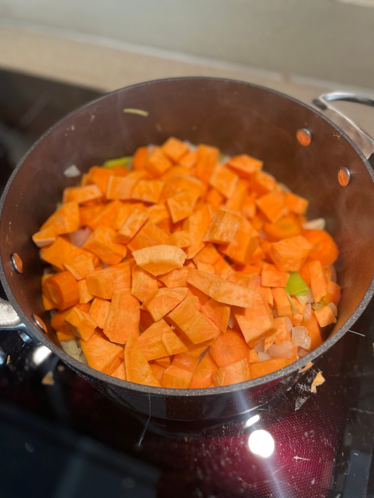 Skala och grovhacka 5-6 morötter och 2 stora sötpotatisar och låt fräsa tillsammans med löken.