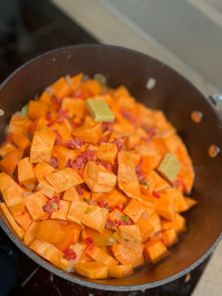 Jag väljer att ha i fryst chili som ger hetta, 2 tsk salt, 2 krm grov svartpeppar, 2 grönsaksbuljong och vatten så det täcker. Låt puttra tills det är mjukt, 20-30 min.