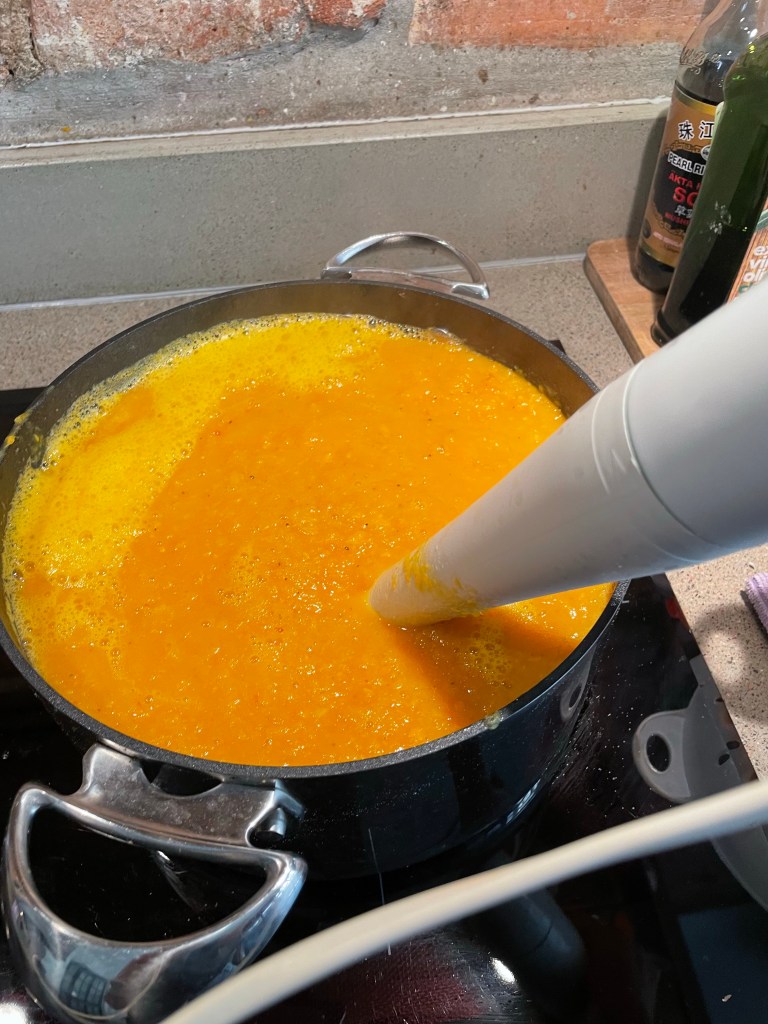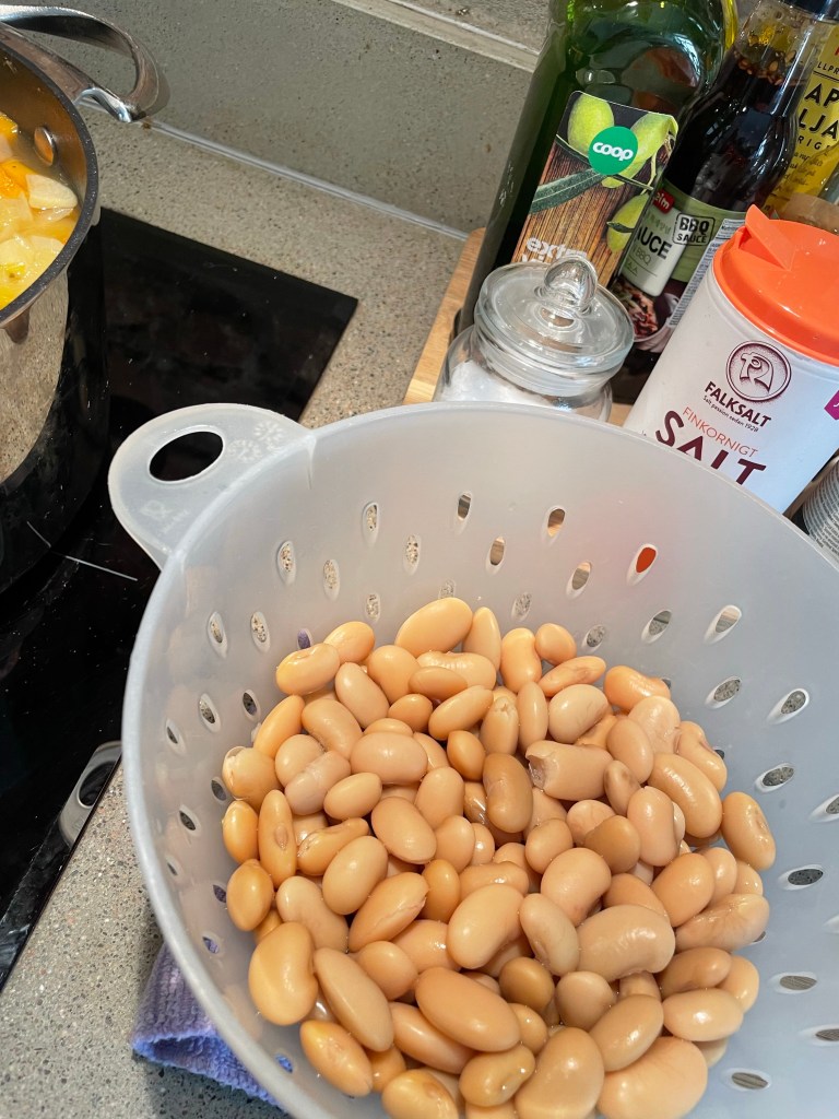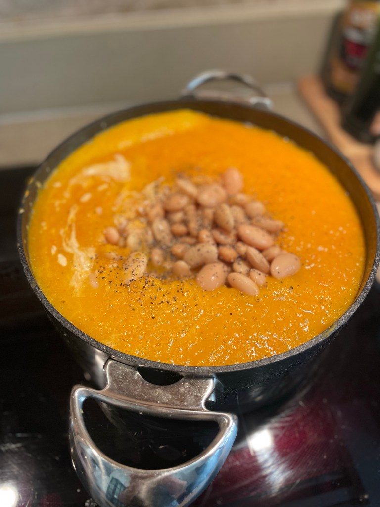 Mixa så soppan blir slät, och häll i 3 st tetra med stora vita bönor, 1-3 dl kokosmjölk (jag tar 1 dl) och låt puttra i ytterligare 10 min. Provsmaka och lägg till ytterligare salt, svartpeppar efter smak. Om du tycker soppan känns för snäll så lägg i lite cayennepeppar.