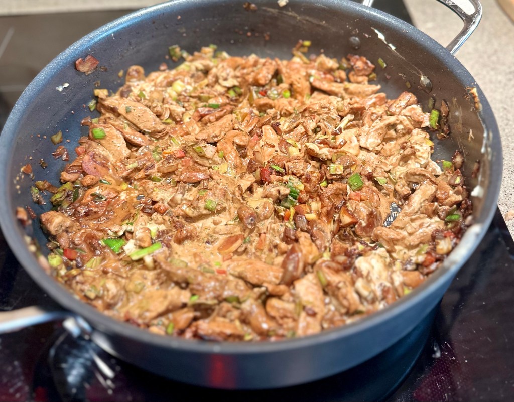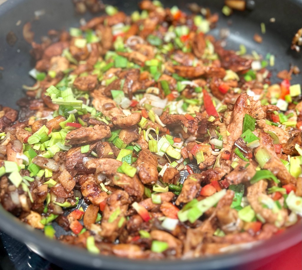 Stek på kycklingen på hög värme med lite smör eller olja så den får färg (men inte genomstekt). Salta och peppra. Tillsätt även alla tre löksorterna och låt det fräsa i 2 minuter. Nu tillsätter du de grovt hackade champinjonerna och rör om. Jag låter dem puttra under lock i 5-6 minuter. Skvätt lite kinesisk soja över alltihop, samt lite svartpeppar igen (kanske 2 krm), ca 2 tsk och låt det puttra in utan lock.