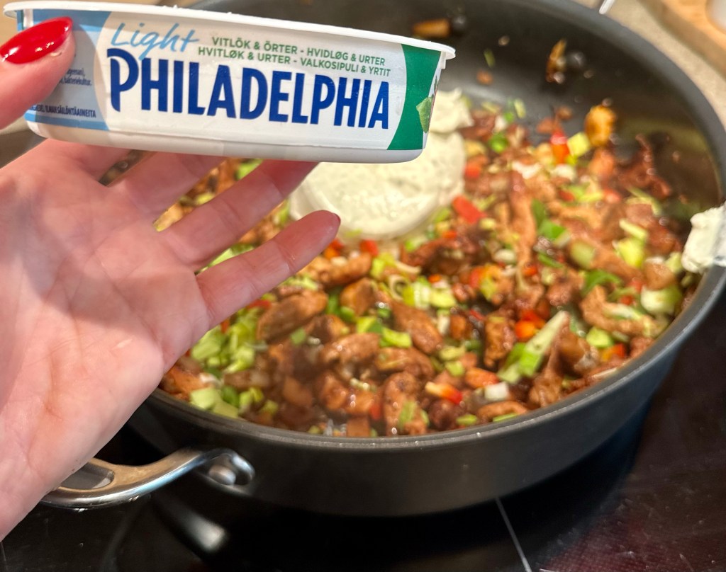 I nästa steg så tillsätter jag paprikan och purjon och efter ca 1 min så klickar jag i Philadelphia osten, rör runt och drar ner värmen och sätter på ett lock.